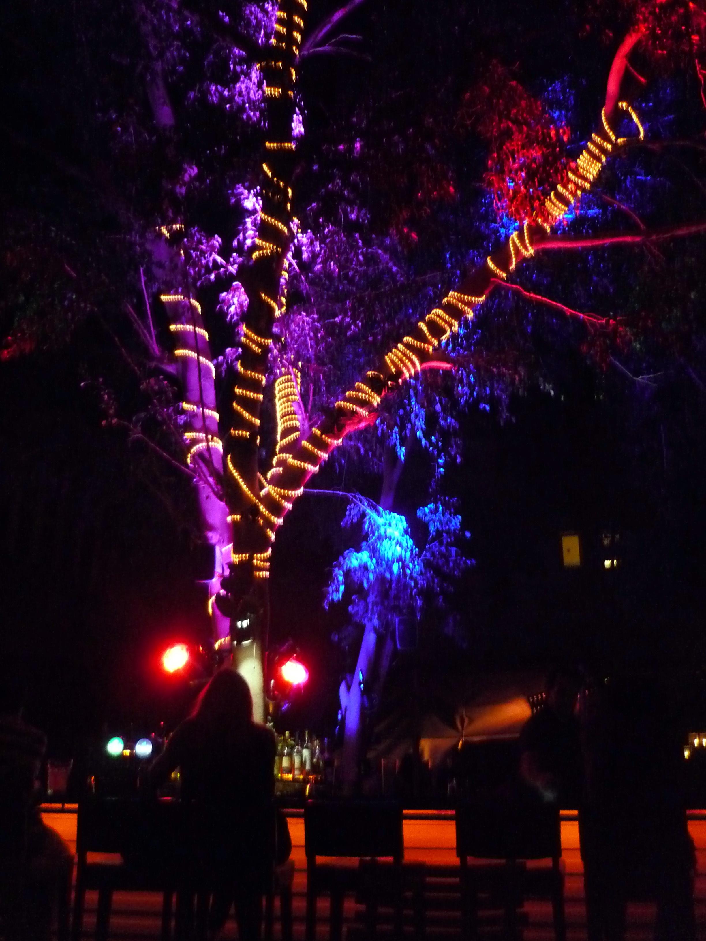 Trees are wrapped in strings of lights, and seating is available at the bar, at tables, and at lounge like enclaves. They serve food from the Saba Gepetto kitchen, although having never eaten at either I can’t say whether it’s the same menu but offering a different, more bar-appropriate menu. The service can be slow but the servers are all very nice and many speak at least some English. This is helpful as the menus are entirely in Hebrew.