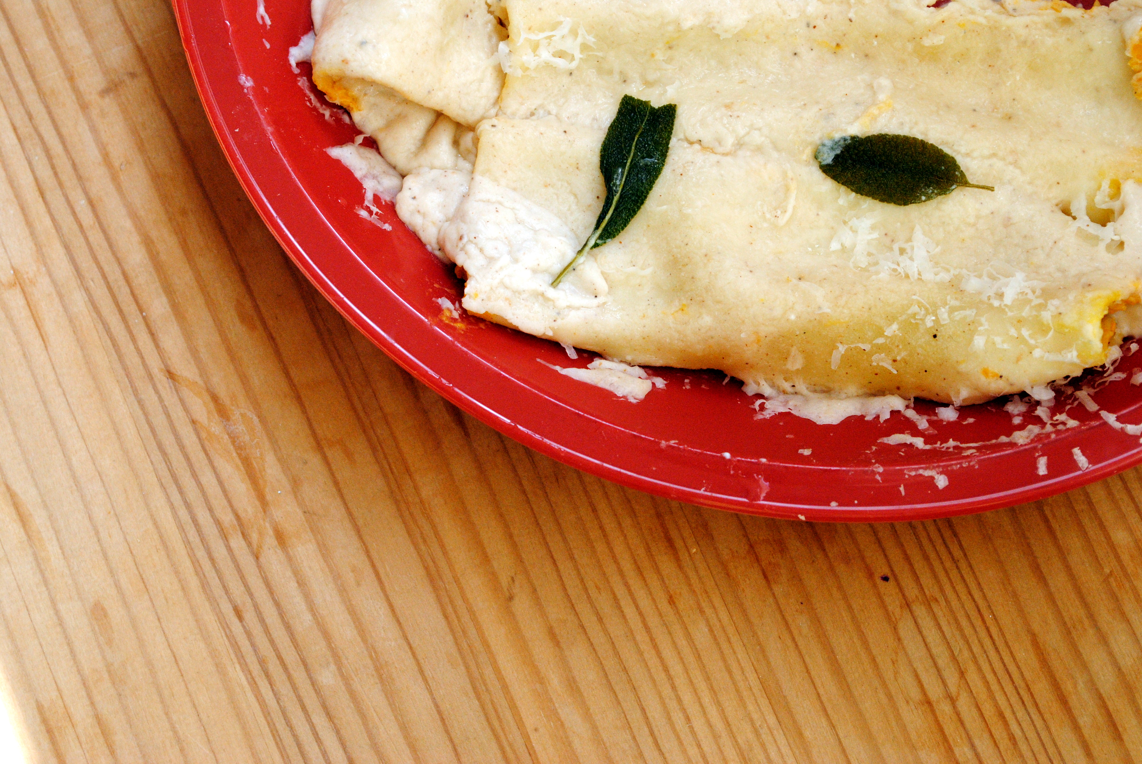 Butternut squash and sage are about as classic a fall combination as you can get. And ever since I got a wonderful little sage plant I’ve been itching to put the leaves to good culinary use. I knew what I wanted to make but after consulting the magical world wide web couldn’t find a recipe that was just right. So I made one up. The result was a filling vegetarian main fit for company. I served it with an arugula salad and grilled eggplant medallions, but anything goes.