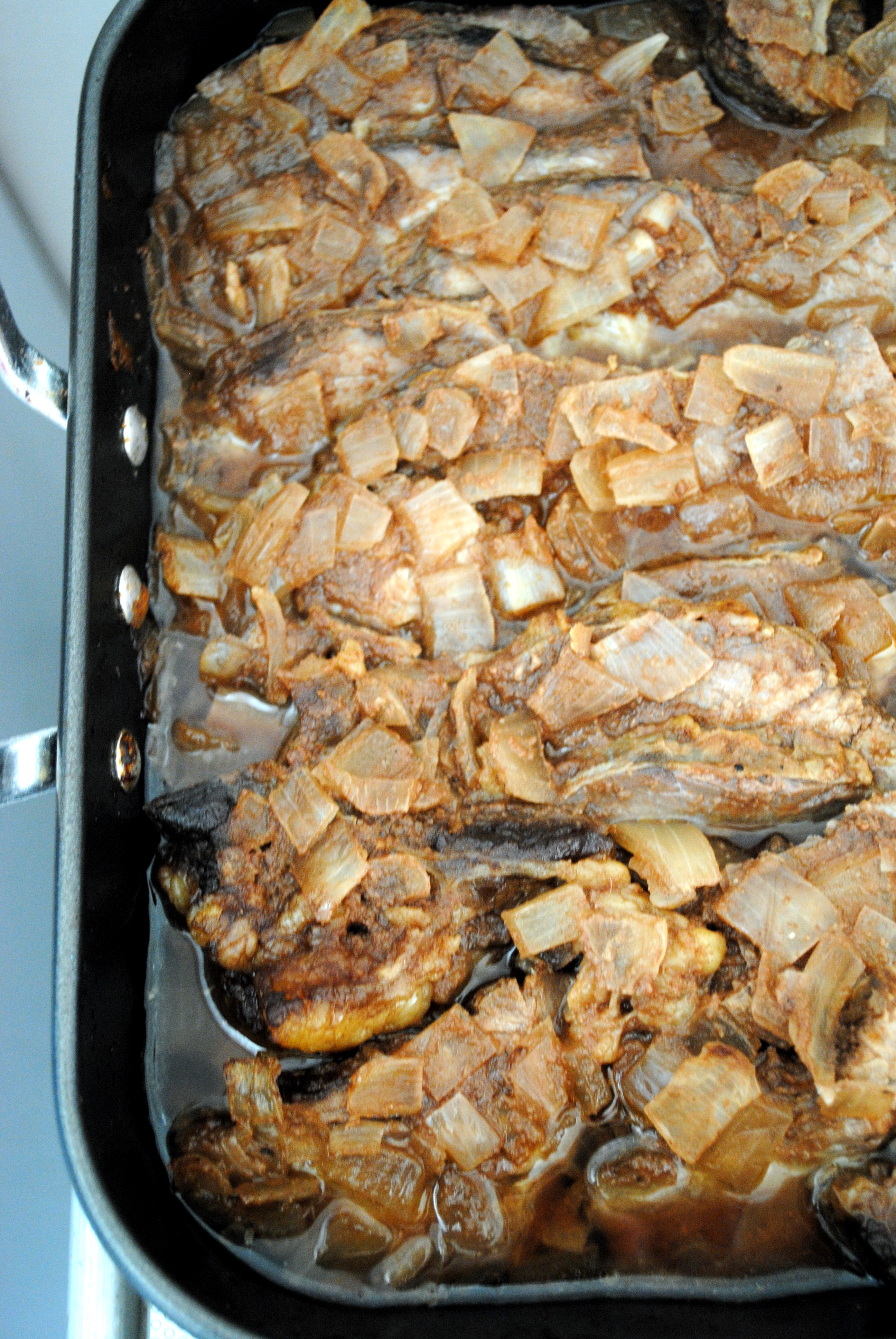 Put the minced onions on the bottom of a large roasting pan. Lay out the meat on top and sprinkle with onion powder, garlic powder and salt. Cover with tin foil and broil until brown. Flip and season the other side with onion powder, garlic powder and salt. Return to the oven and roast at 350F for 1 hour. In a separate container mix together the ketchup and water until well combined. Pour into the roasting pan, adding more water if necessary. Return to the oven and roast, covered, for another half an hour. Flip the meat every half an hour and add more water if needed. Cook