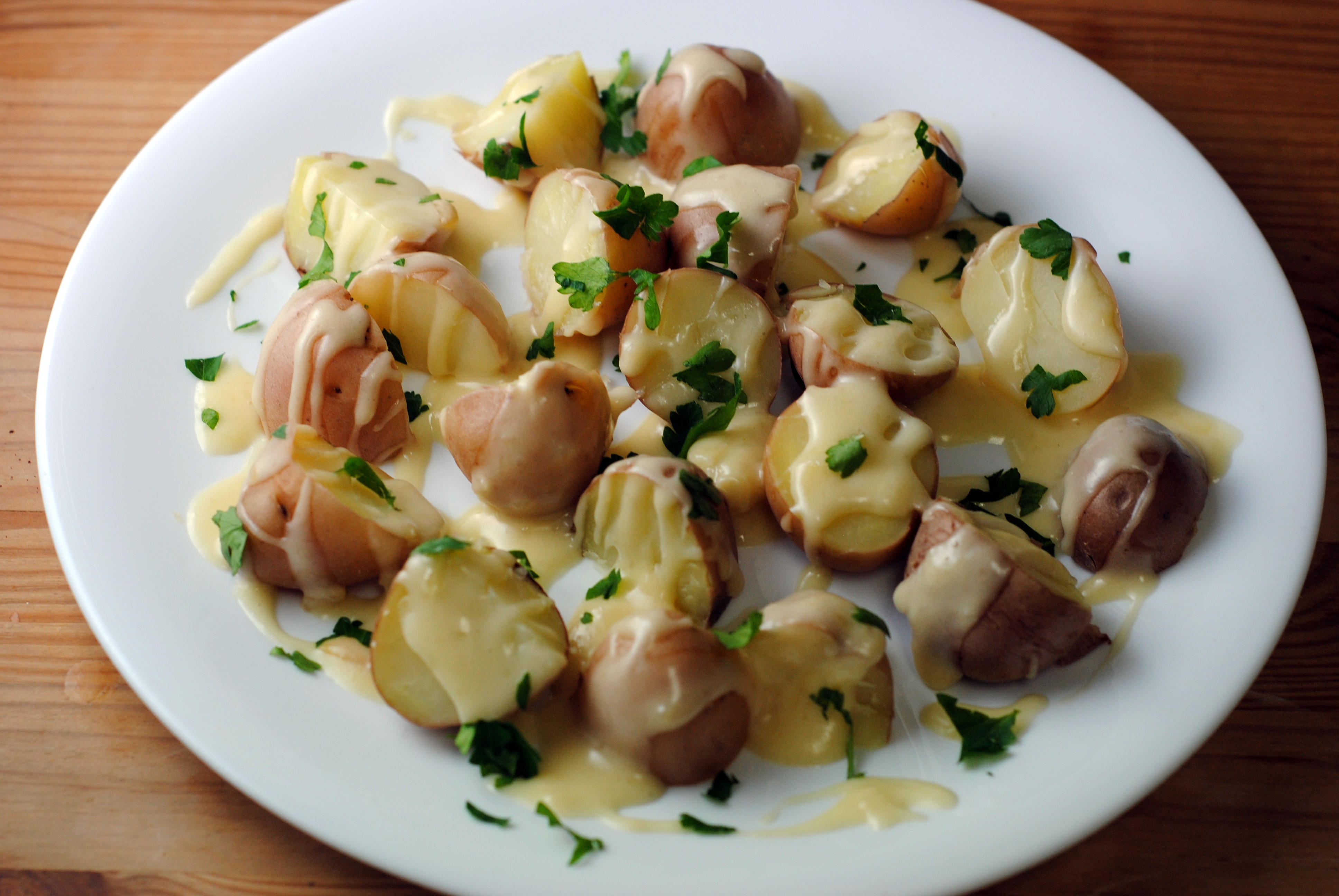 I decided to make a sort of raclette fondue hybrid by melting raclette cheese with white wine in the traditional fondue style, then drizzling it over small boiled new potatoes, to be enjoyed in the traditional raclette style. In this way it becomes more of a plated appetizer, a fusion of two great Swiss melted cheese dishes.
