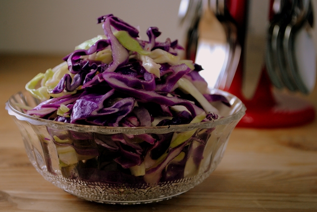 Back when the Second Avenue Deli was actually on Second Avenue (it’s now on 33rd and 3rd), we used to go there at least once a year with Evan’s family. The brusque, seasoned waitstaff would immediately bring pickles and health salad to the table before you even had a chance to order your first Dr. Brown’s. Growing up I had a fear (yes, I would call it a fear) of mayonnaise and so never liked coleslaw. In general, cabbage evoked memories of my Chinese upstairs neighbors cooking it in huge quantities and I avoided it whenever possible (honestly, it rarely made an appearance in my Italian-American household). This health salad – simply shredded cabbage mixed with oil and vinegar – was a new phenomenon to me. Still, I respectfully abstained.