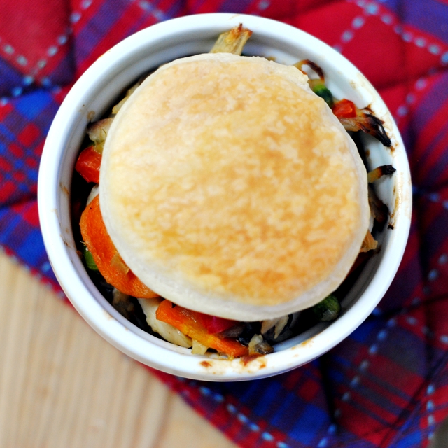 And I find that the presentation of individual pot pies is a little more elegant, suitable for entertaining or just fun to have your own little package of food. You can easily make this in one baking dish, however, just lay some of the puff pastry on the bottom and top with the same amount of rounds. Or, for a more traditional preparation, bake it into a covered pie crust.