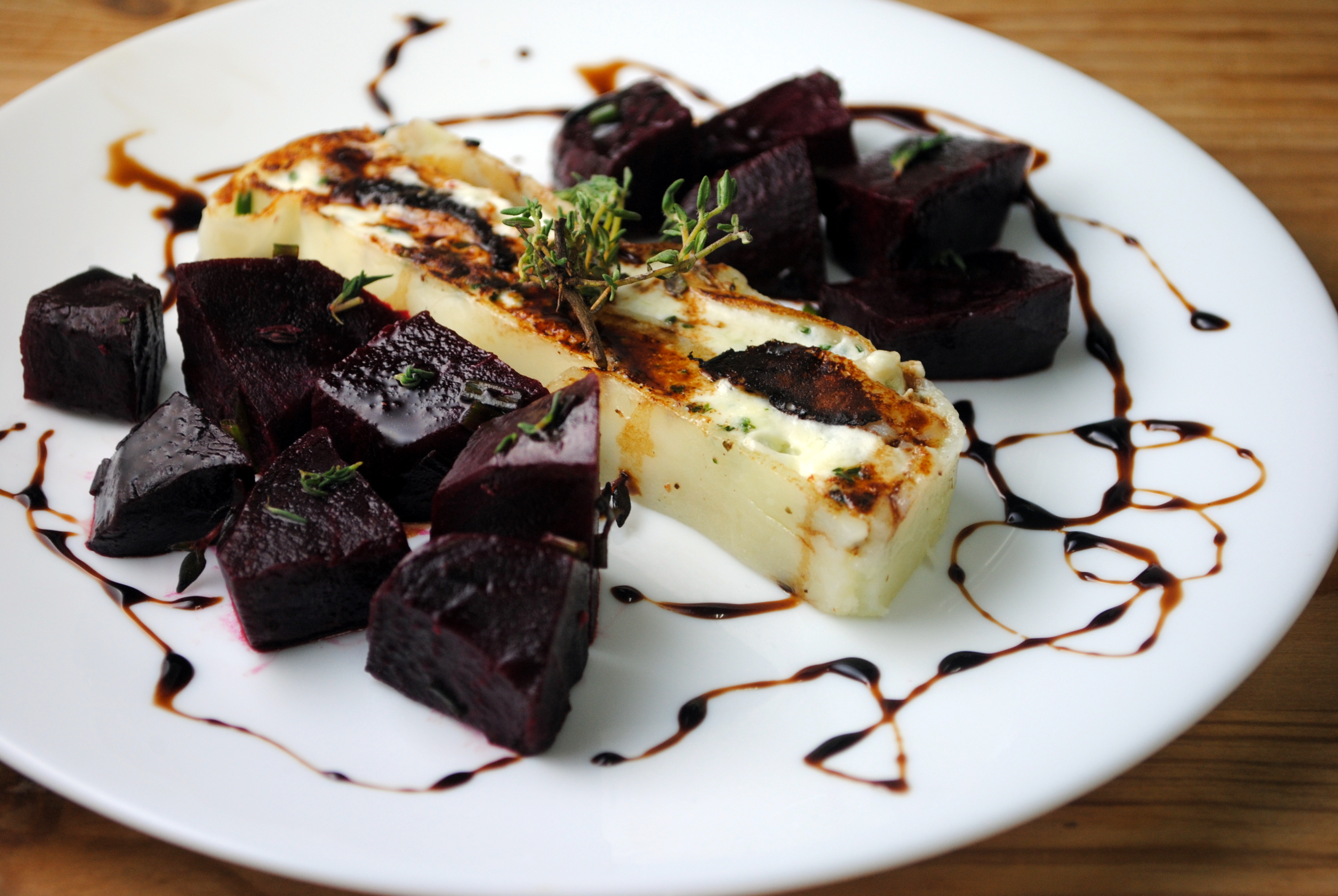 Potato and Goat Cheese Terrine with Thyme-Roasted Beets and Balsamic Reduction