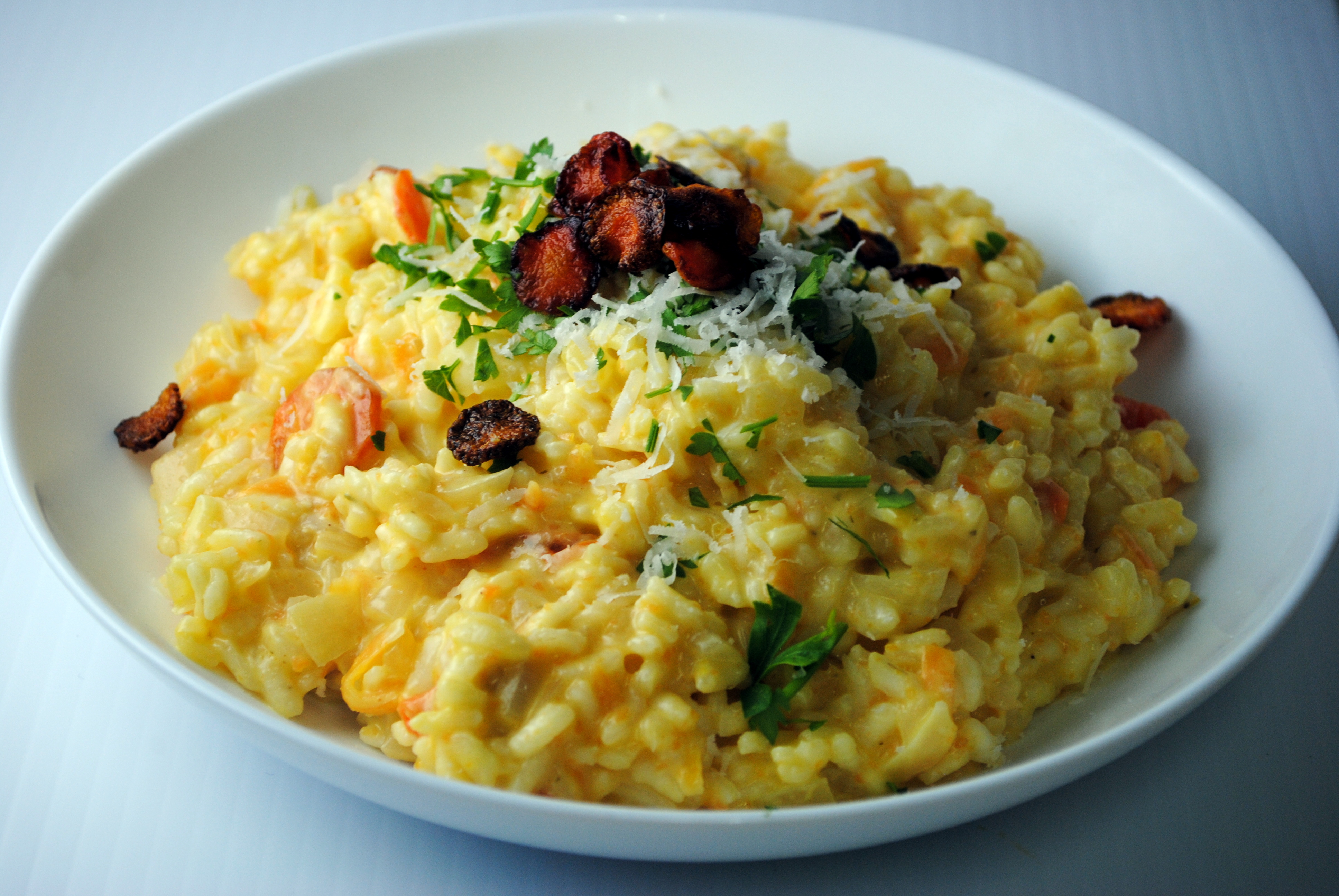 Add the roasted and caramelized carrots (leaving some for garnish). Stir in the mascarpone and Parmesan. To serve, spoon the risotto into shallow bowls and garnish with Parmesan, chopped parsley, and roasted and caramelized carrots.