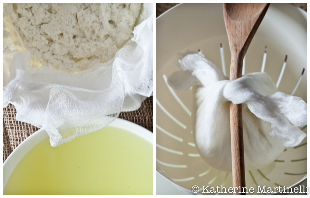 - Carefully pour into the cheesecloth-lined strainer. Allow to drain for a few minutes. Tie up the ends of the cheesecloth to form a bundle. Hang the cheesecloth bundle over a bowl or sink (I like to put a wooden spoon through the opening of the bundle and rest it over the strainer, which I leave over a shallow bowl.